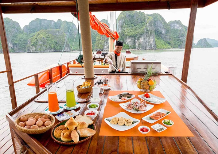 - Sau khi lên thuyền 15 phút, quý khách có vé đặt ăn tối sẽ bắt đầu thưởng thức ẩm thực với các món ăn đa dạng từ Á đến Âu.